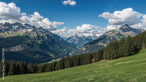 Fototapeta premium Magnificent view of frost-covered mountain ranges complemented by lush greenery and towering evergreens under a serene sky with fluffy clouds.
