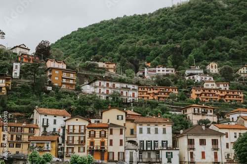 Obraz premium magnificent view of mountains clouds and small village near ocean water...
