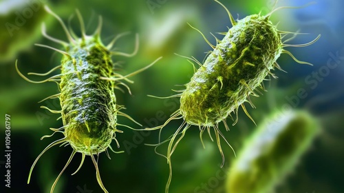 © Natchooda, Naklejka premium Magnified view of Salmonella bacteria under a microscope, illustrating the dangerous pathogens responsible for foodborne illnesses.