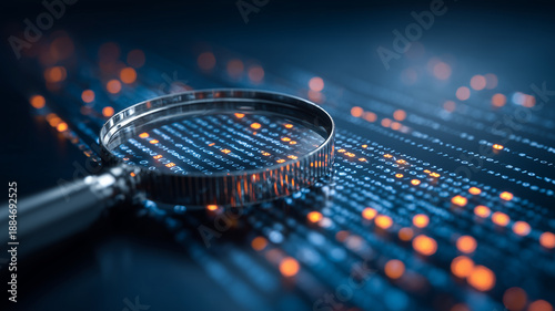 © kaliel, Fototapeta premium Magnifying glass examining computer code and data streams symbolizing cybersecurity investigation and digital forensics.