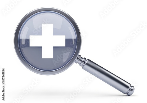 Obraz premium Magnifying glass tool displays a white cross symbol against a glossy grey...
