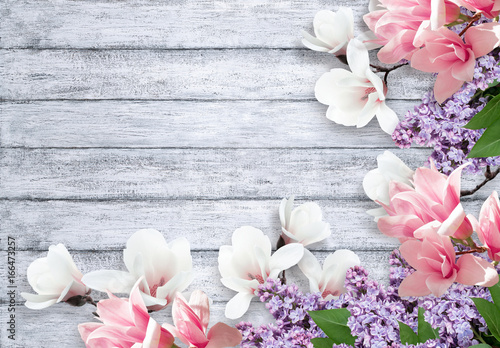 Naklejka premium Magnolia and lilac flowers on shabby background