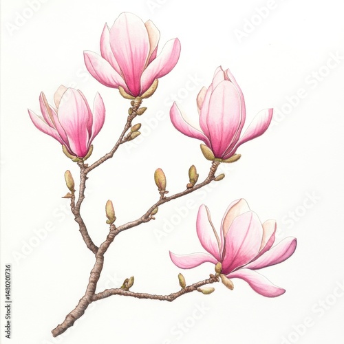 Fototapeta premium Magnolia branch watercolor illustration pink blossoms botanical art close up spring bloom flowering tree