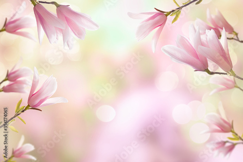 © Marina Kaiser, Obraz premium Magnolia branches on a blurred natural background of nature with sunlight and bokeh. Spring seasonal background