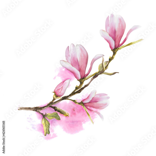 Fototapeta premium Magnolia flower bough Watercolor Hand drawn Illustration isolated on white background with pink stains