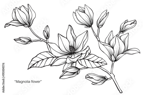 Naklejka premium Magnolia flower drawing illustration. Black and white with line art.