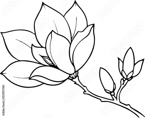© SHAHID, Obraz premium Magnolia Flower in Bloom Line Art on transparent background.