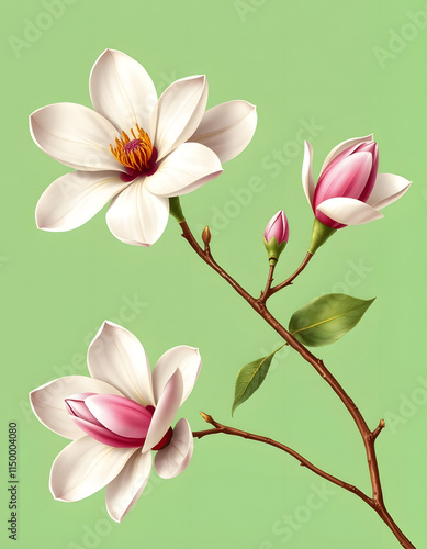 © SusDmi, Fototapeta premium Magnolia flower isolated on transparent background, old botanical illustration, pop-art, with white tones