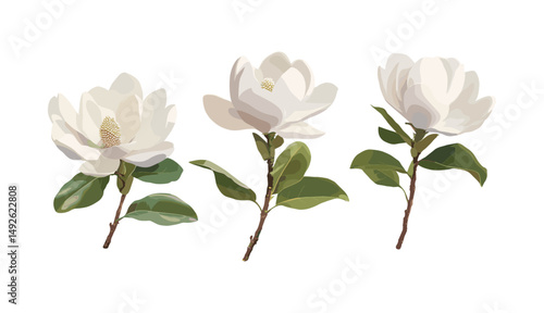 Obraz premium Magnolia Grandiflora cutout, Southern Magnolia Bull Bay set, vector illustration, floral elements, green tree branch, realistic plant, isolated, elegant botanical background, png.