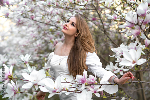 Fototapeta premium Magnolia. Magnolia Tree Garden. Young beautiful girl in magnolia tree flowers.