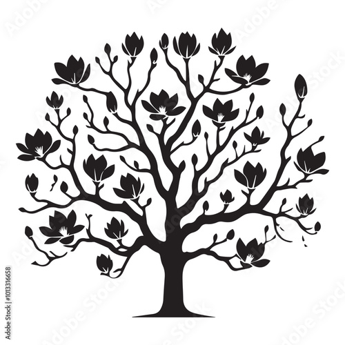 © Shineoxstock, Obraz premium Magnolia Tree Vector illustration in black and white - Magnolia Plant Silhouette Design