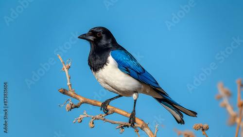 © Eric, Fototapeta premium Magpie on a Branch - A beautiful bird with iridescent blue wings against a blue sky