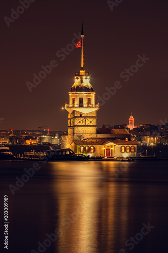 Naklejka premium Maiden's Tower, Maiden's Tower, night view, city lights, sea, landscape, mosque, history, art, artistic, night scene, istanbul, turkey, peace, spacious, comfort, long exposure, city views, istanbul ni