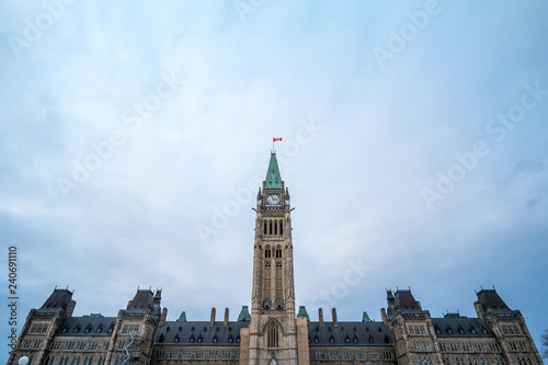 © Jerome, Fototapeta premium Main clock tower of the center block of the Parliament of Canada, in the Canadian Parliamentary complex of Ottawa, Ontario. It is a major landmark, containing the Senate and the house of commons