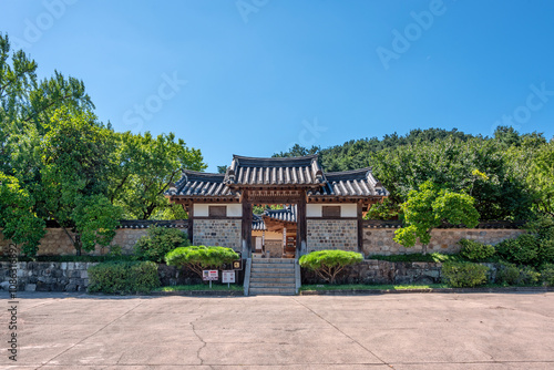 © Beautiful Korea, Fototapeta premium 김정희 선생 고택의 대문, 18세기 건립, 충청남도 문화유산-Main gate of the historic residence of Chusa Kim Jeong-hui, built in the 18th century, a cultural heritage site in Chungcheongnam-do, South Korea