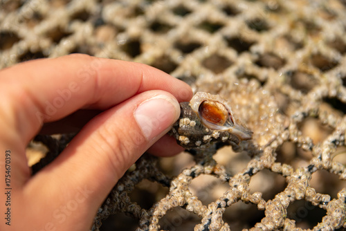 © Johanna, Fototapeta premium Main tenant un bigorneau perceur sur les mailles d'une poche à huîtres