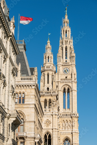 Fototapeta premium Main tower of the Vienna city hall building with neo-gothic architectural style