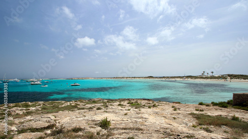 © nachosuko, Obraz premium Main view of Ses Illetes beach, on of the most amazing and iconic spots of Formentera Island, Spain.