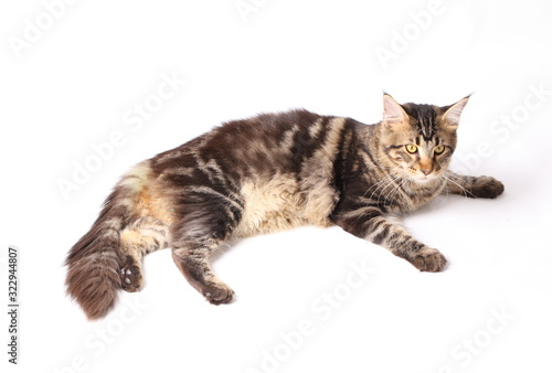 © Suwit, Obraz premium Maine Coon cat, 9 months old, laying in front of white background