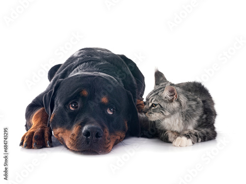 © cynoclub, Fototapeta premium maine coon kitten and rottweiler