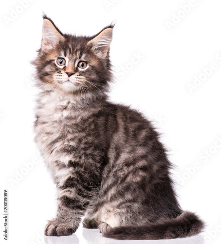 © DenisNata, Obraz premium Maine Coon kitten 2 months old. Cat isolated on white background. Portrait of beautiful domestic black tabby kitty.