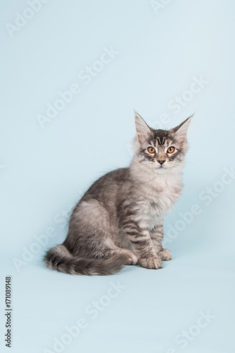 © Ivonne Wierink, Fototapeta premium Maine coon kitten sitting in studio on blue