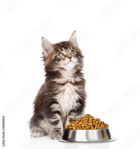 © Ermolaev Alexandr, Fototapeta premium maine coon kitten sitting with a bowl of dry cat food and looking up
