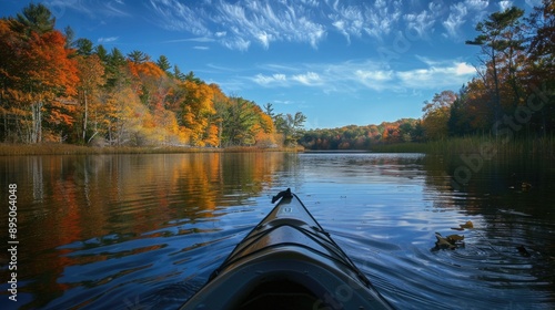 © Serhii, Naklejka premium Maine River. Kayaking on Fall Lake with Scenic Autumn Landscape