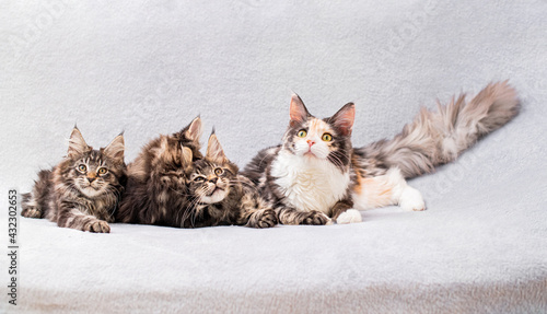 Fototapeta premium Mainecoon family mom cat and three kittens lie on light fluffy blanket