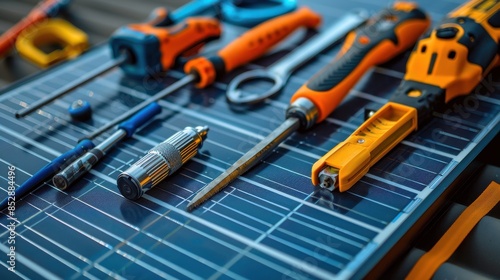 Fototapeta premium Maintenance tools organized for fieldwork on solar panels, outdoor repair theme, closeup view, illustrating readiness and efficiency, advanced tone, analogous color scheme