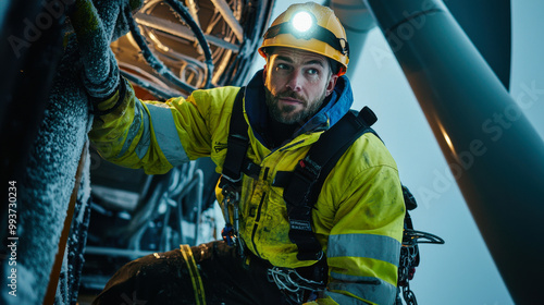 © kongkiat chairat, Fototapeta premium maintenance worker in yellow jacket and helmet climbs offshore wind turbine in snowy conditions, showcasing determination and focus