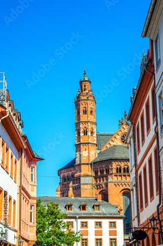 © Aliaksandr, Fototapeta premium Mainz Cathedral or St. Martin's Cathedral Roman catholic church building and traditional german houses