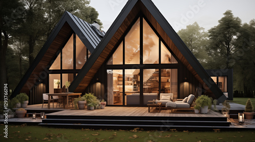 © FlyStun, Obraz premium Maison d'architecture moderne, design scandinave, villa de luxe. Arrière-plan pour conception et création graphique.