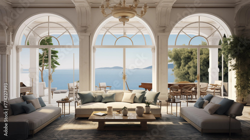 Fototapeta premium Maison d'architecture moderne, villa de luxe avec balcon vue sur la mer. Maison de style Méditerranée. Arrière-plan pour conception et création graphique.