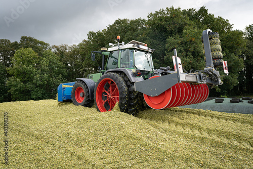 Fototapeta premium Maissilage wird geschoben und verdichtet mit moderner Landtechnik.