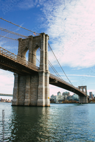 © Hendrik, Obraz premium Majestätische Brooklyn Bridge über dem East River bei blauem Himmel