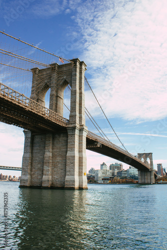 Obraz premium Majestätische Brooklyn Bridge über dem East River bei blauem Himmel