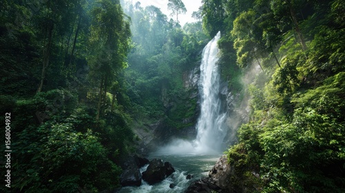 © vectorartificer, Fototapeta premium Majestatyczny wodospad spływający kaskadami po skałach otoczonych bujną, zieloną roślinnością tropikalną w mglistej pogodzie