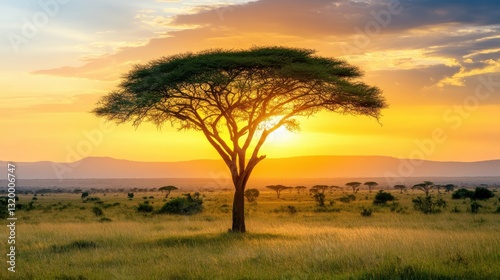 Obraz premium Majestic Acacia Tree Against Sunset Landscape in African Savanna with Vibrant...