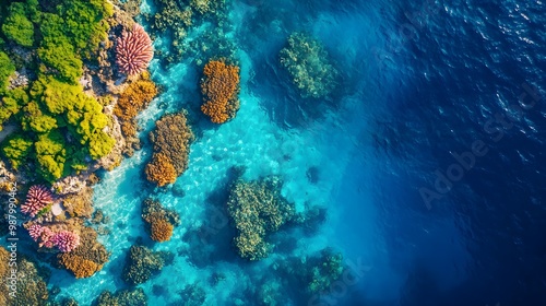 Fototapeta premium Majestic aerial shot of a colorful coral reef, rich with marine life, bright corals, swirling fish, and clear turquoise waters, bathed in sunlight