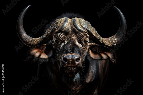 Naklejka premium Majestic African buffalo close up portrait isolated on dark black background...