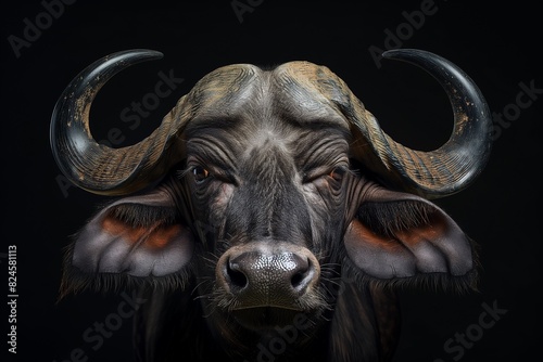 Naklejka premium Majestic African buffalo close up portrait isolated on dark black background...