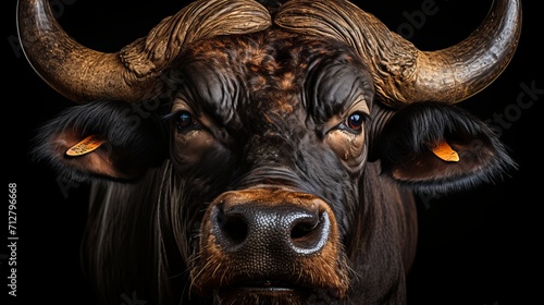 Naklejka premium Majestic african buffalo portrait on black background wildlife photography