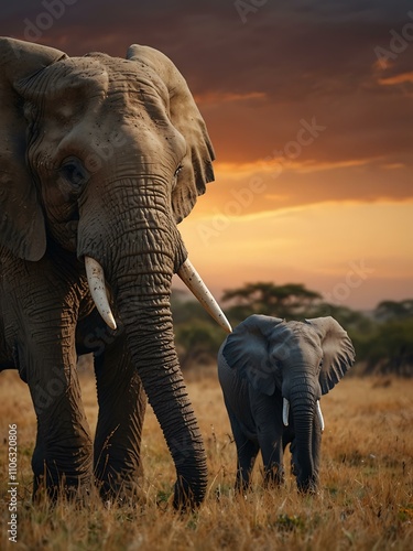 © claudunia, Naklejka premium Majestic African elephant family in a serene environment.