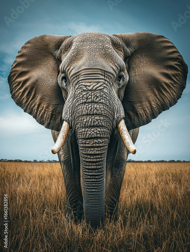 Naklejka premium Majestic African elephant, powerful presence, savanna grasslands