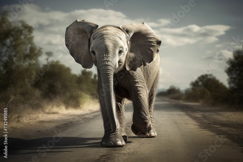© Wirestock, Obraz premium Majestic African elephant walking along a rural dirt road, ai-generated