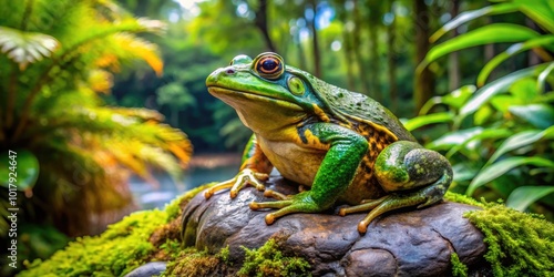 © Arnada, Fototapeta premium Majestic African Giant Frog Sitting on a Rock Surrounded by Lush Greenery in Natural Habitat