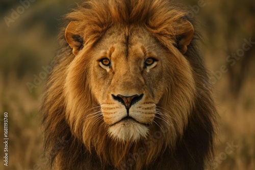 Obraz premium Majestic African lion portrait with golden mane and powerful expression in...