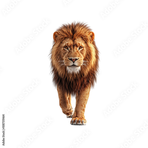 © HKTArt4U, Obraz premium Majestic African Lion Walking Towards the Camera on White Background