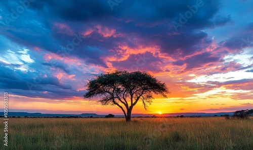 Obraz premium Majestic African Savanna Sunset with Dramatic Sky and Acacia Tree, Vibrant...